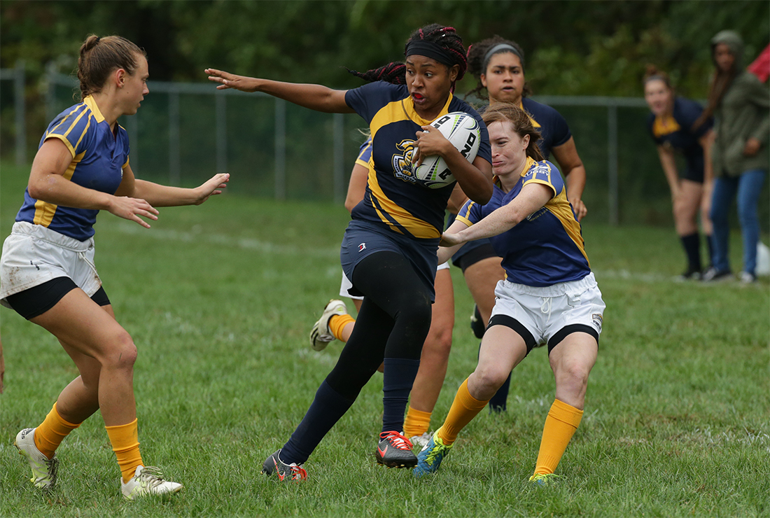 Becky Burns punching in one of the first tries of the game for Neumann, Natalya Receuver, a first time rugby player, would score her first try ever,